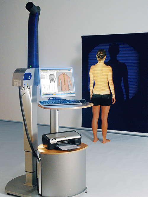 Zusätzliche diagnostische Sicherheit liefert die 3-D- Wirbelsäulenvermessung. Dabei handelt es sich um ein neues Untersuchungsverfahren, mit dem ohne Anwendung von Röntgenstrahlen Wirbelsäulenerkrankungen wie z. B. Skoliosen (Wirbelsäulenverkrümmungen) erfasst werden können.
